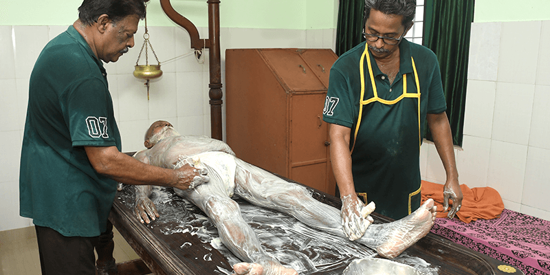 SPS is a special method of administration of Njavara type of rice cooked in milk and Bala decoction, later tied as boluses in muscling cloth. It is a type of Mrdu Snigdha Pinda Sweda. It is atypical swedana with cold potency (seetavirya) and nourishing (balya) drugs, and to the effect, tissue replenishment (brmhana). This soft heating and massaging facilitate the nutrition from within, without injuring the tissues.